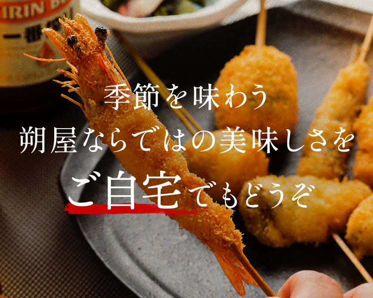 当店がお届けしている季節の味わいを用いた創作串揚げを、通販でお買い求めいただけます。お店でご提供しているものと違わない品々はその時々の旬を捉えた一期一会の味わい。ご自宅でお店さながらの本格的な1本をご堪能いただける事うけあいです。日常のお食事をはじめ、誕生日、記念日、パーティーといったお集まりの際にも大変便利。どうぞ朔屋がお届けする至極の美味しさで賑わっていただければ幸いです。